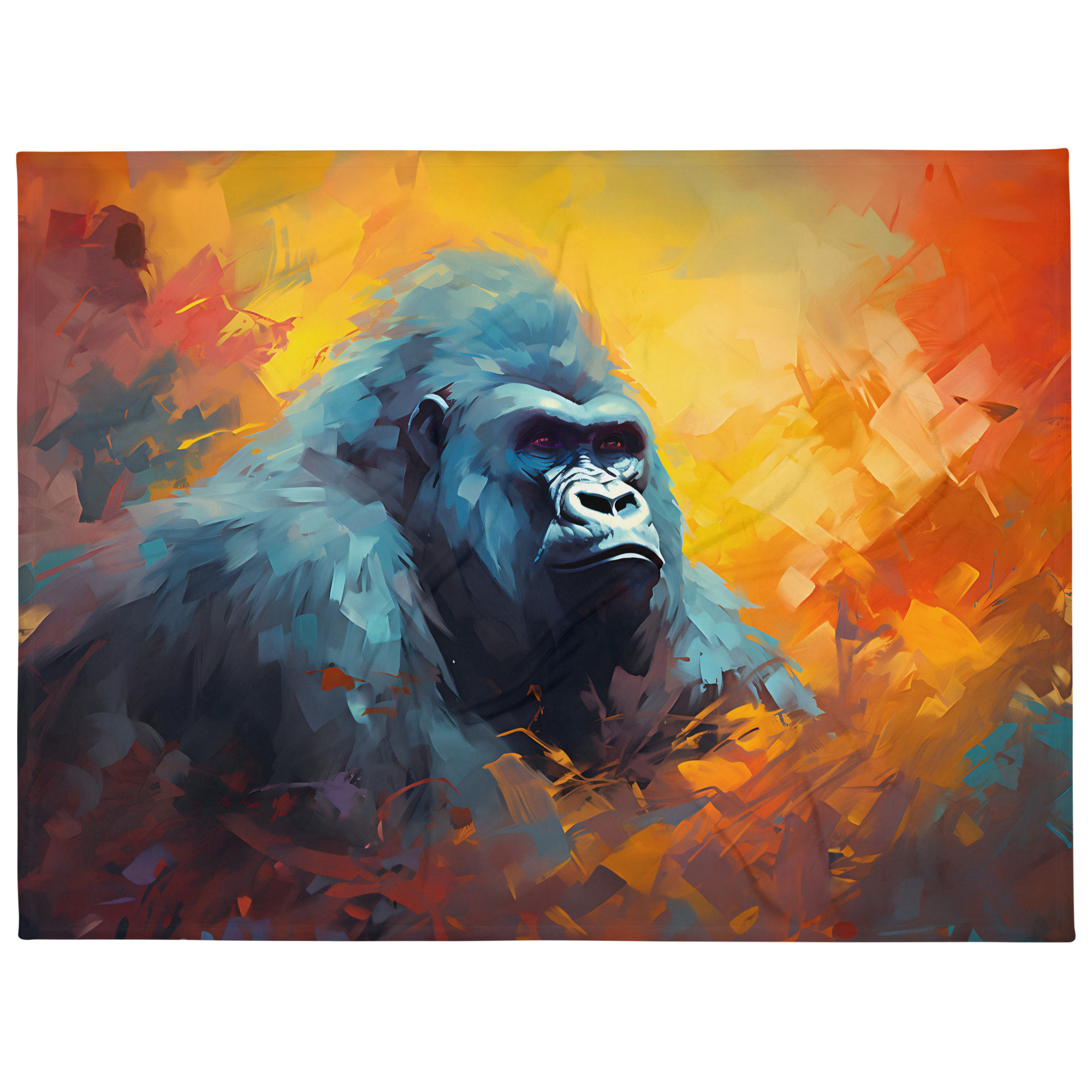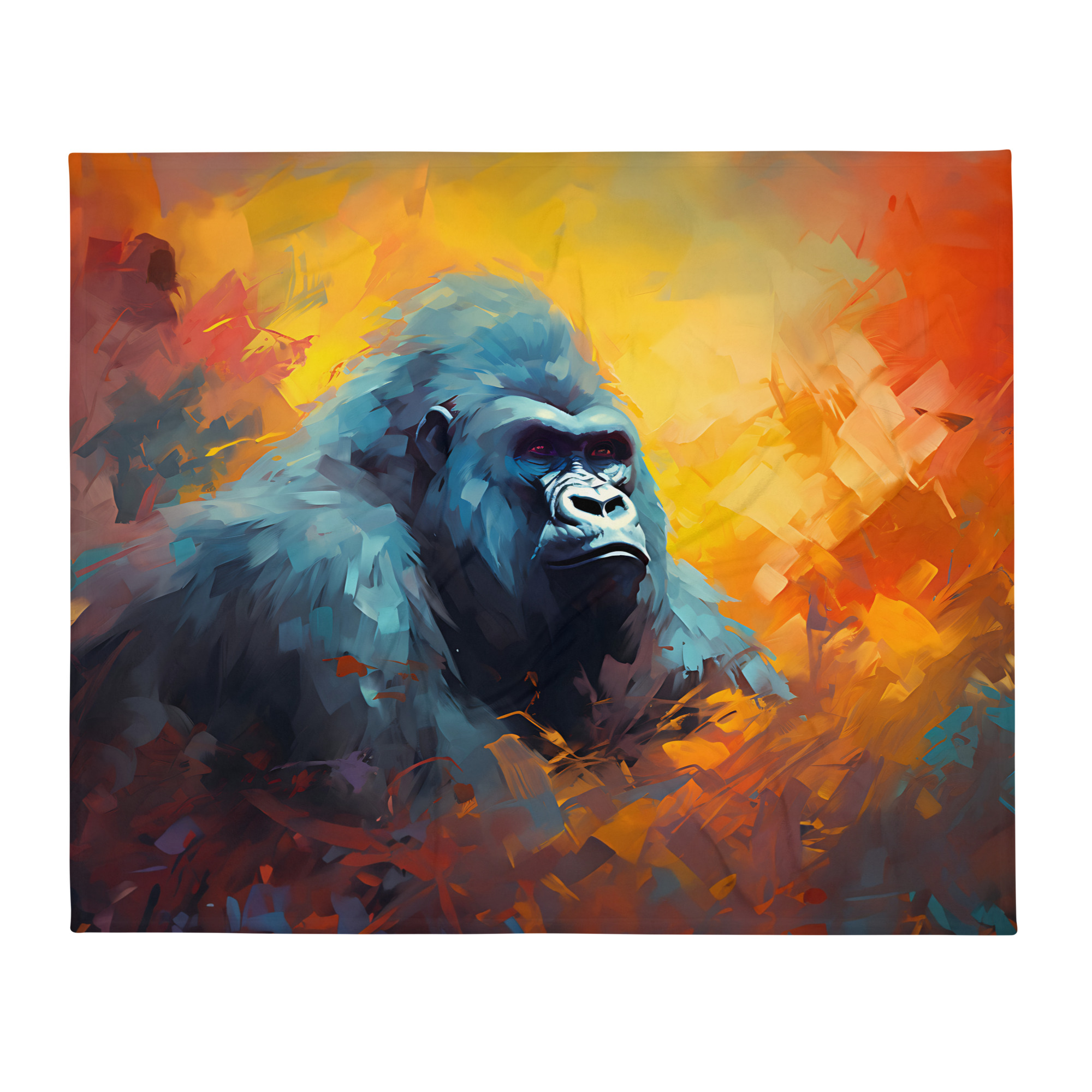 “Mystic Silverback” is a profound portrayal of the gorilla, steeped in the deep hues and shrouded mystery of the jungle. In this piece, the silverback is depicted with a gaze that is both penetrating and peaceful, its eyes reflecting an ancient wisdom. The textures and colors around it—the deep purples, the shadowy greens, and the sudden bursts of light—create an almost spiritual aura. The artwork captures the gorilla’s raw power and noble tranquility, inviting onlookers to ponder the silent stories hidden in the dense foliage of its natural habitat. Each brushstroke builds upon the next to form a tapestry that is as enigmatic as the creature it celebrates.
